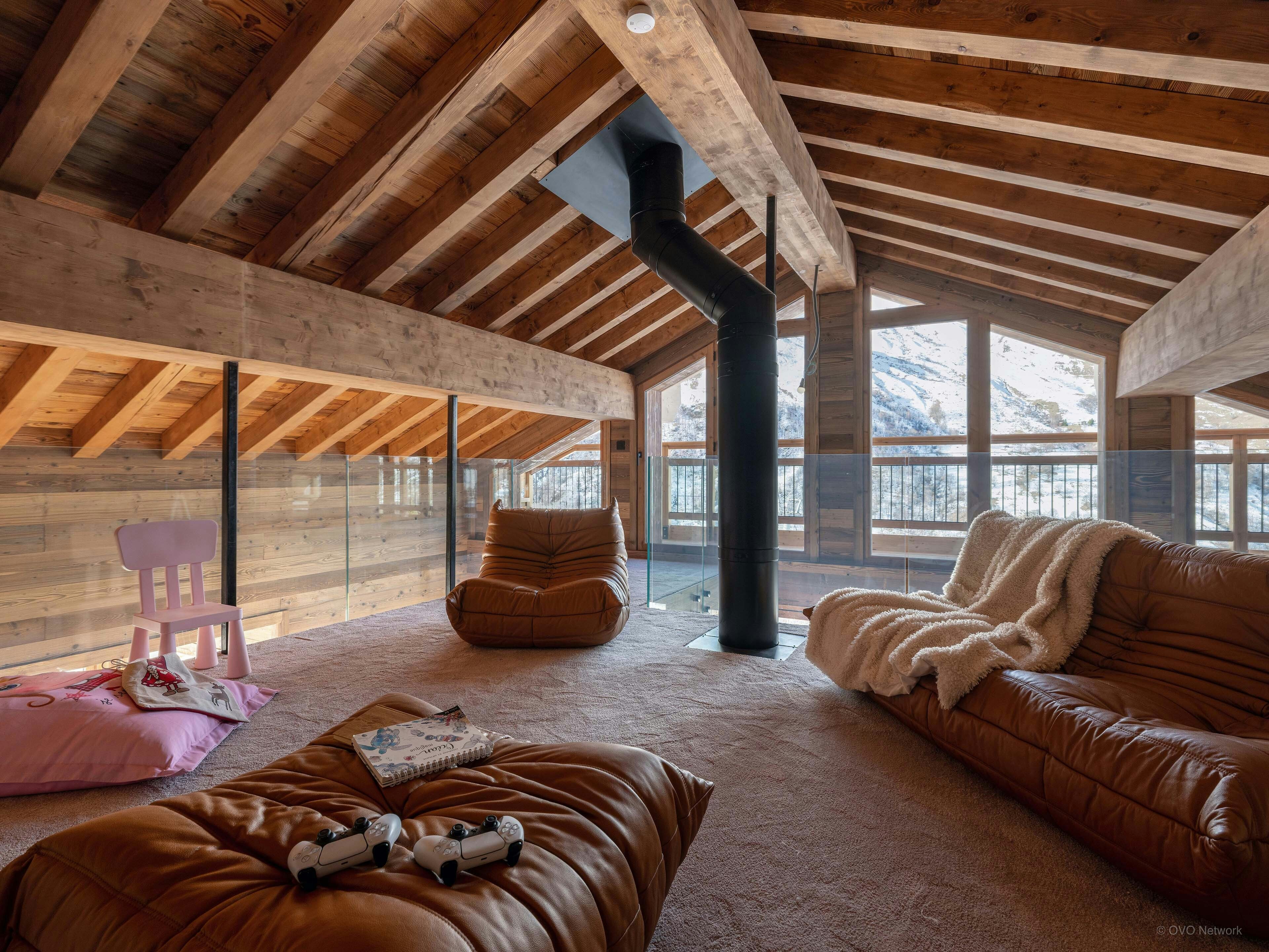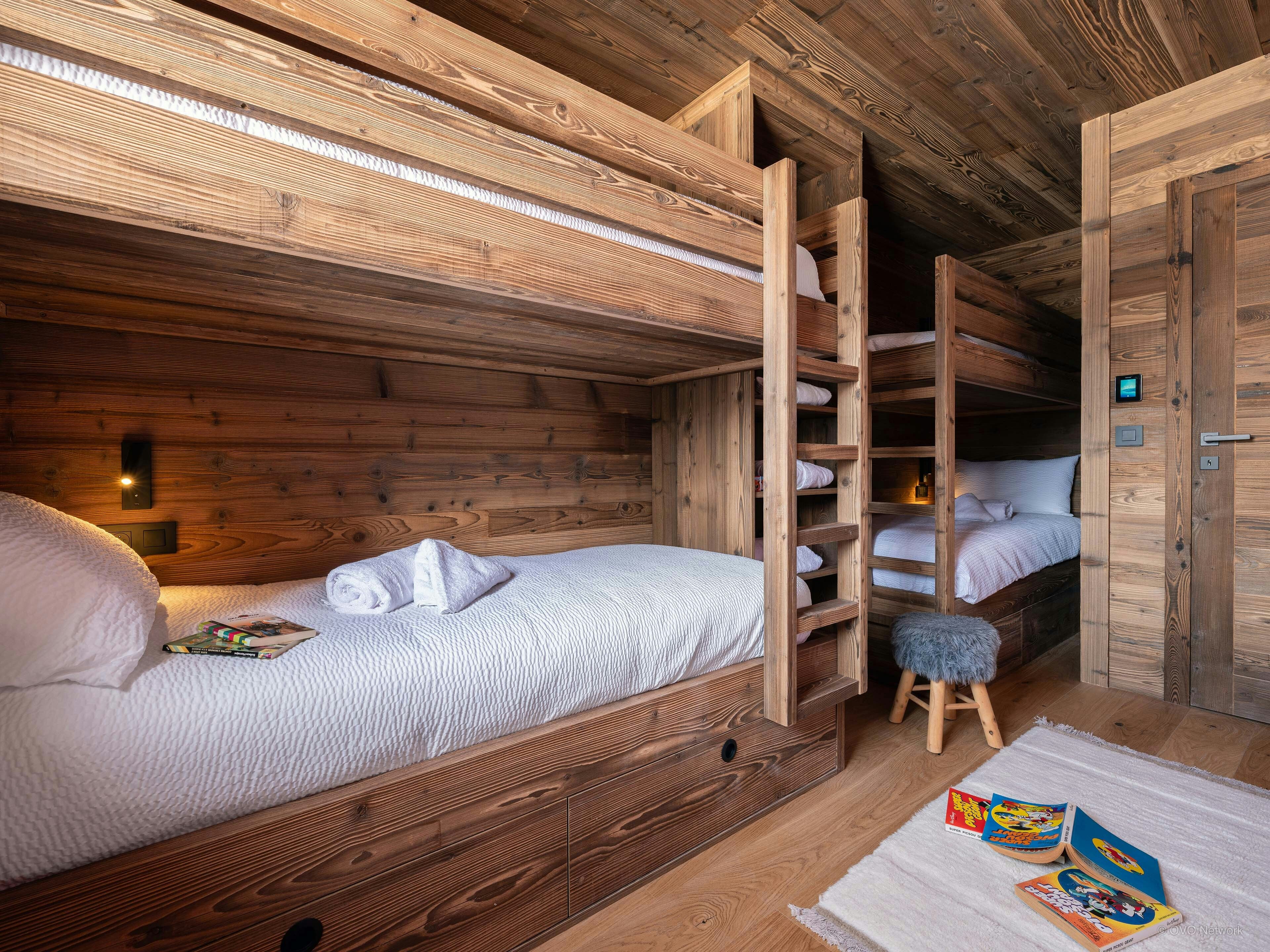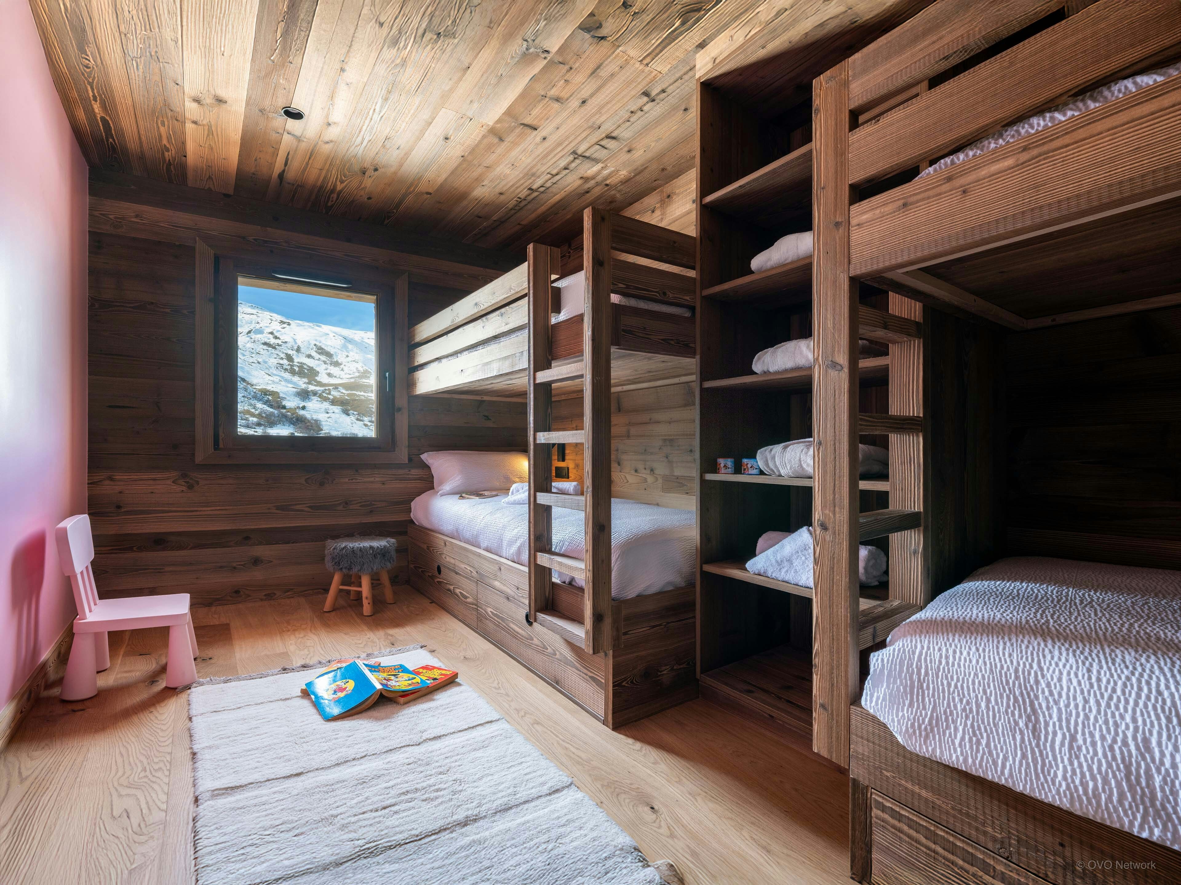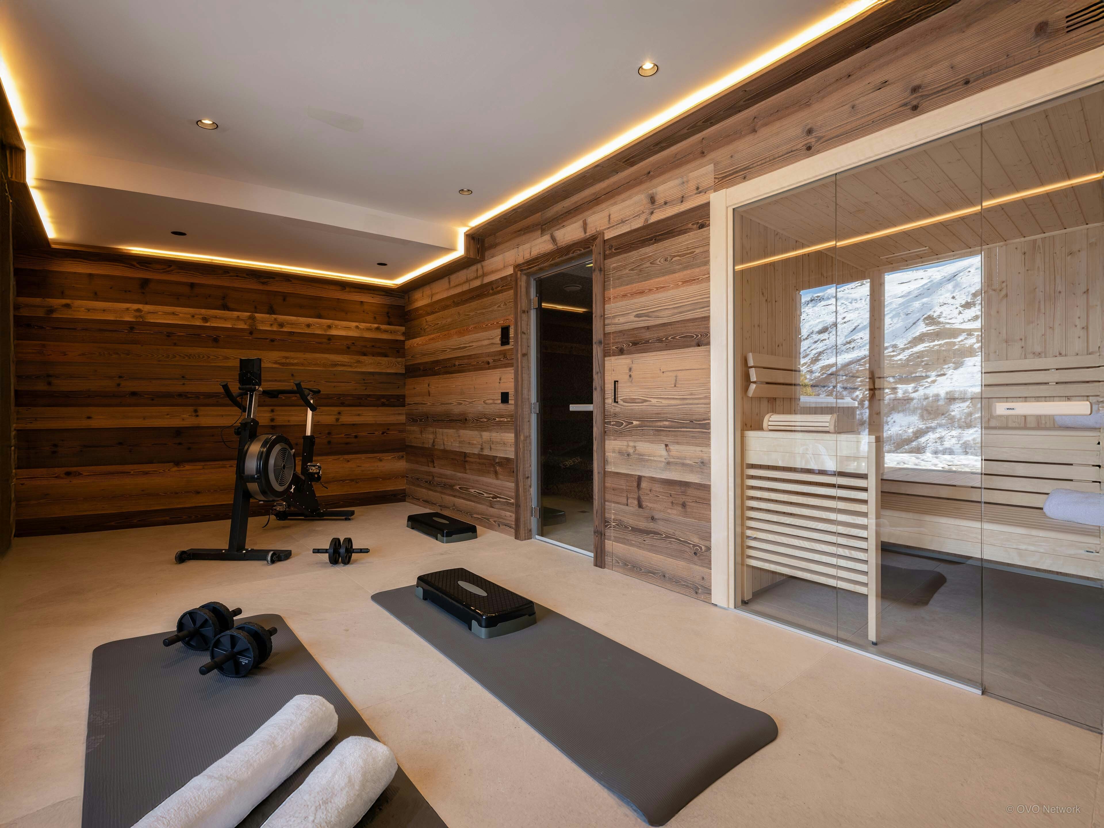 There are five double en-suite bedrooms on the lower floor, as well as a children’s room for four. This floor also houses the chalet's wellness area, with a sauna, steam room, and a gym that opens onto a terrace with a hot tub.