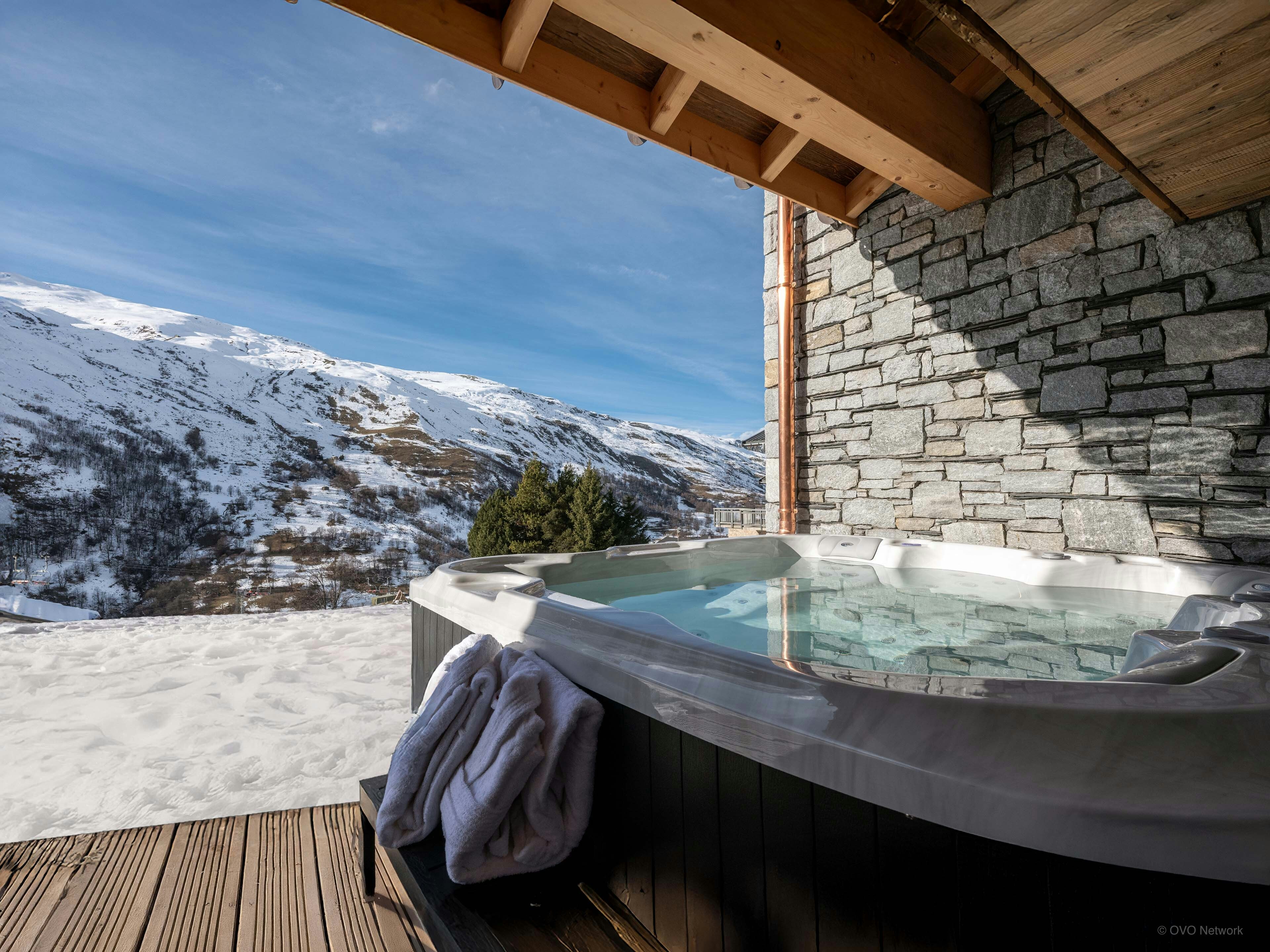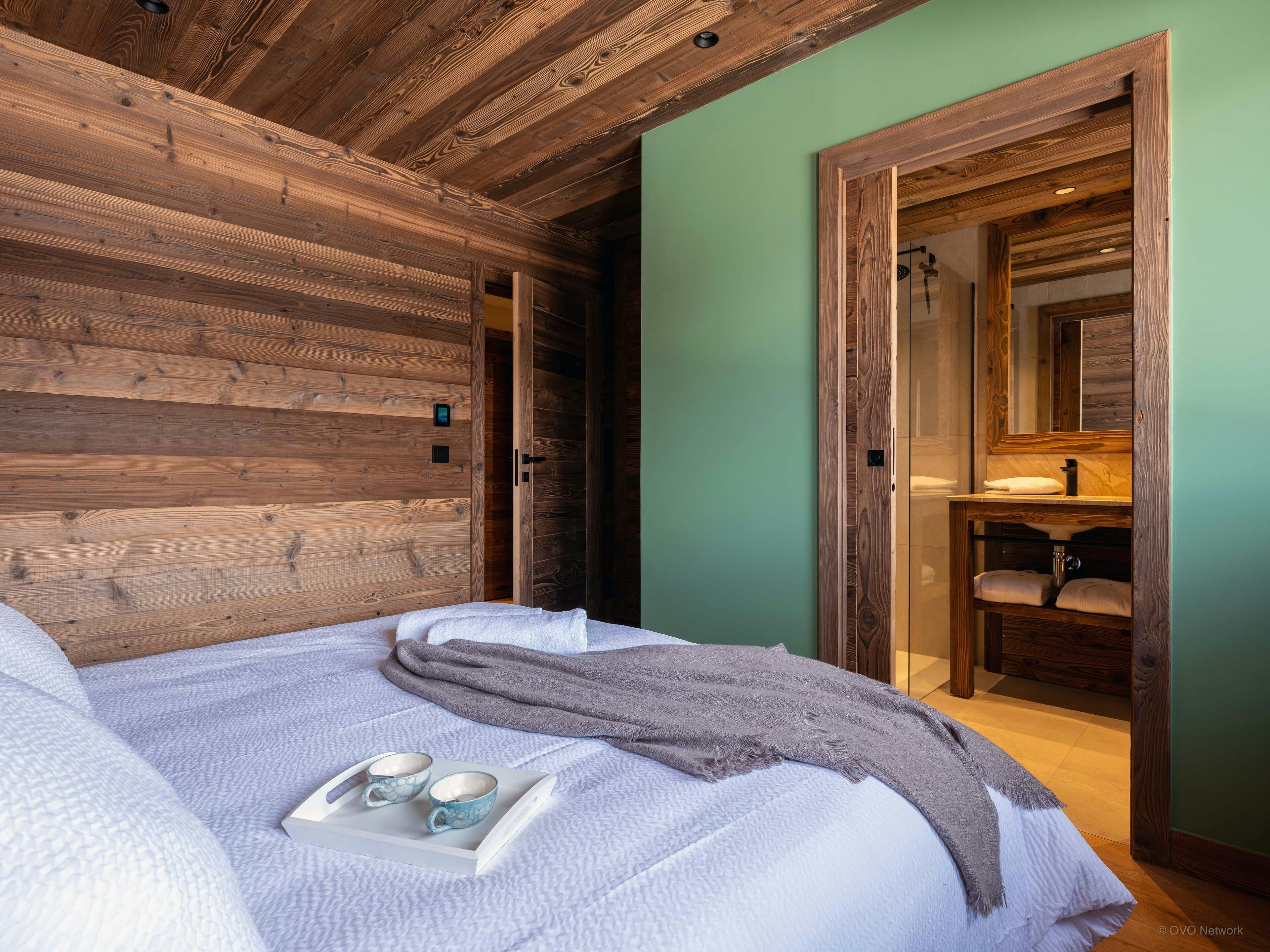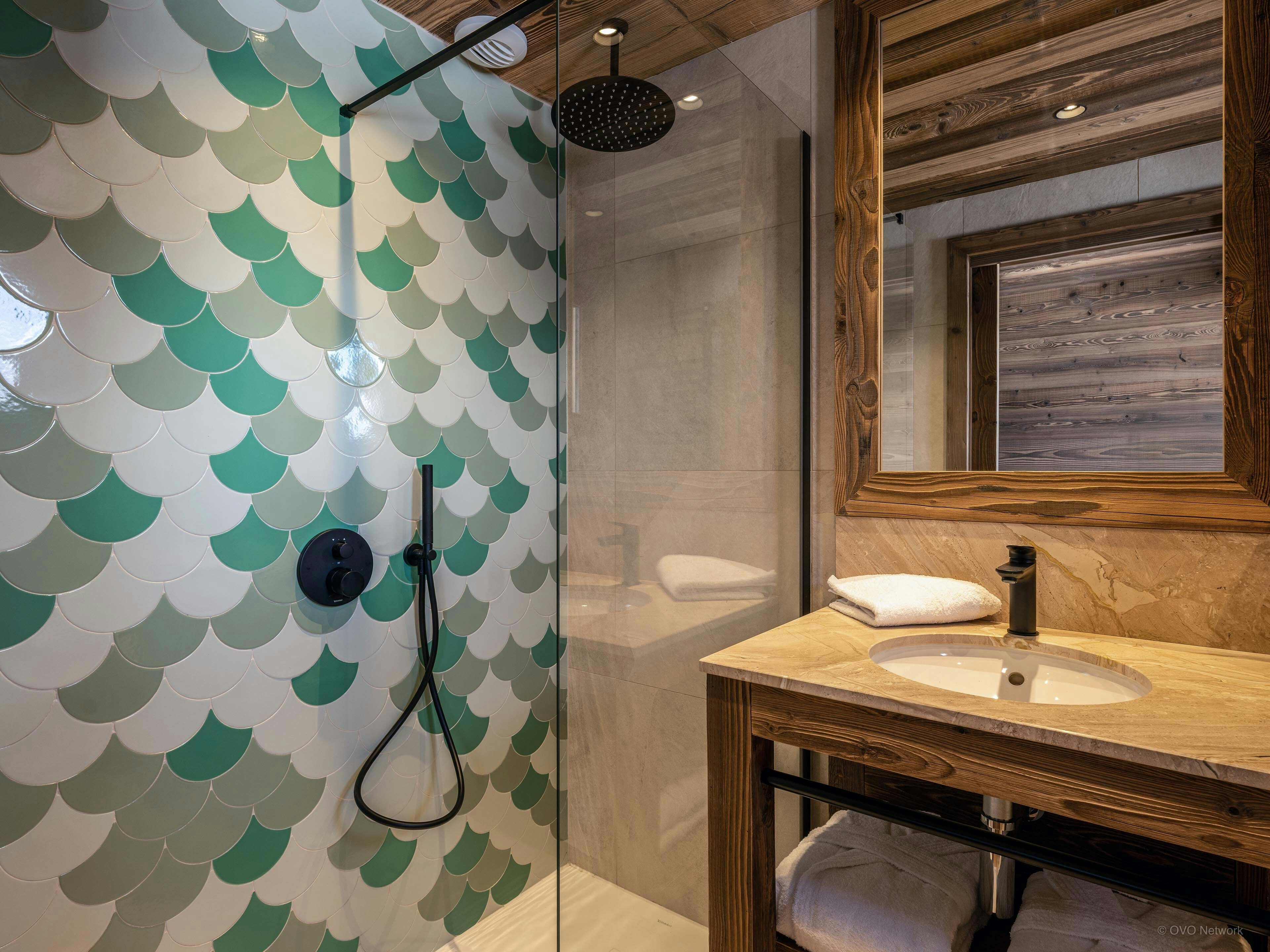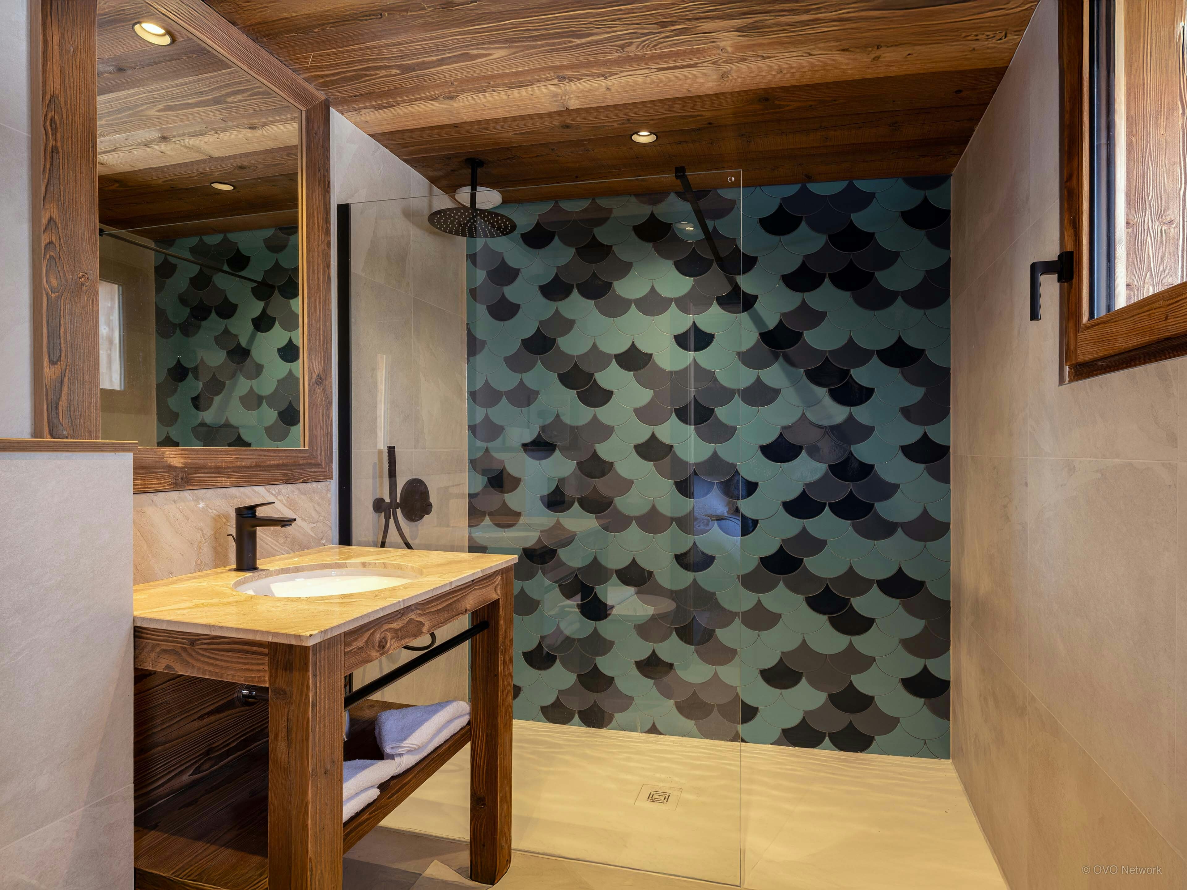 There are five double en-suite bedrooms on the lower floor, as well as a children’s room for four. This floor also houses the chalet's wellness area, with a sauna, steam room, and a gym that opens onto a terrace with a hot tub.