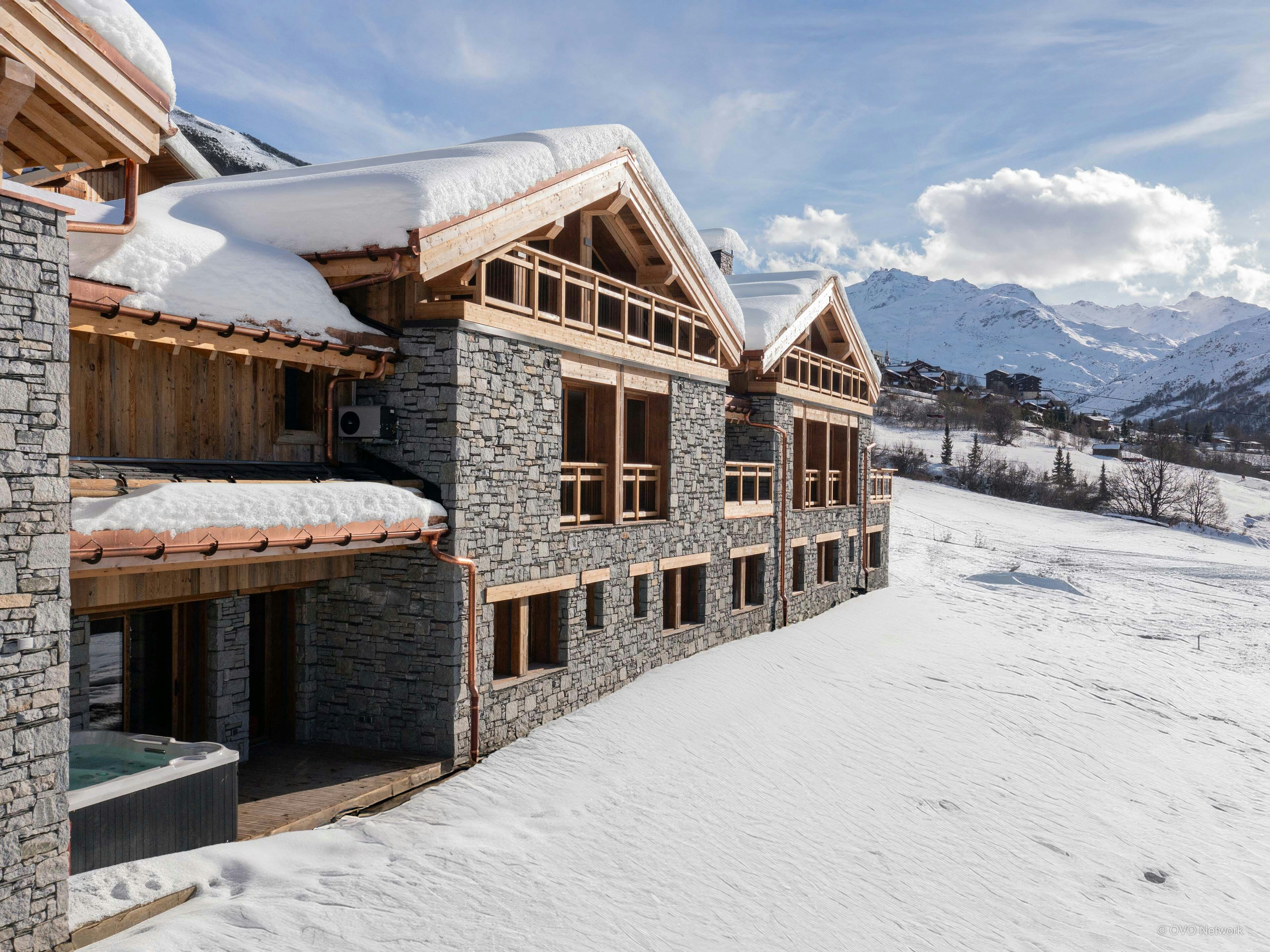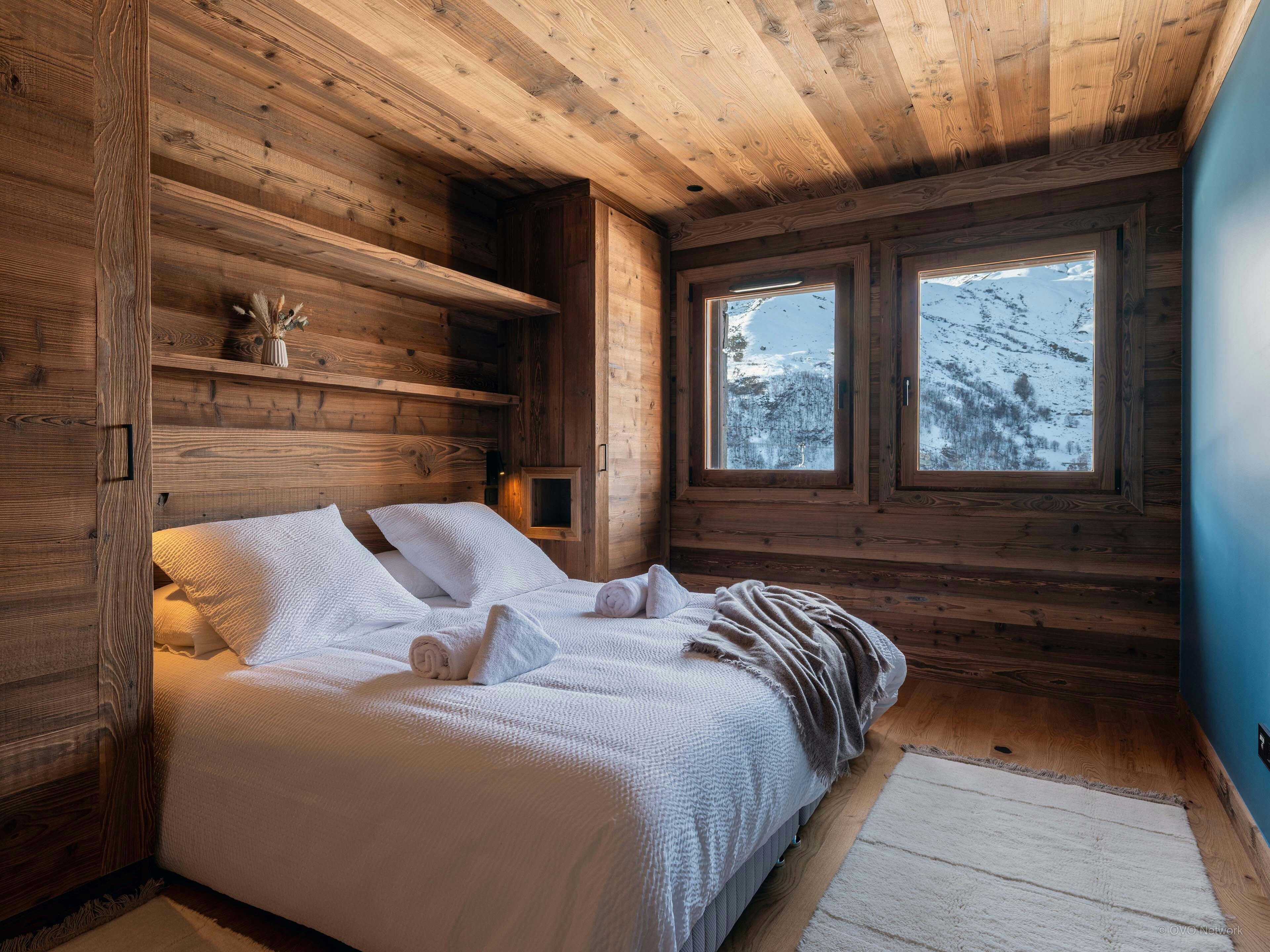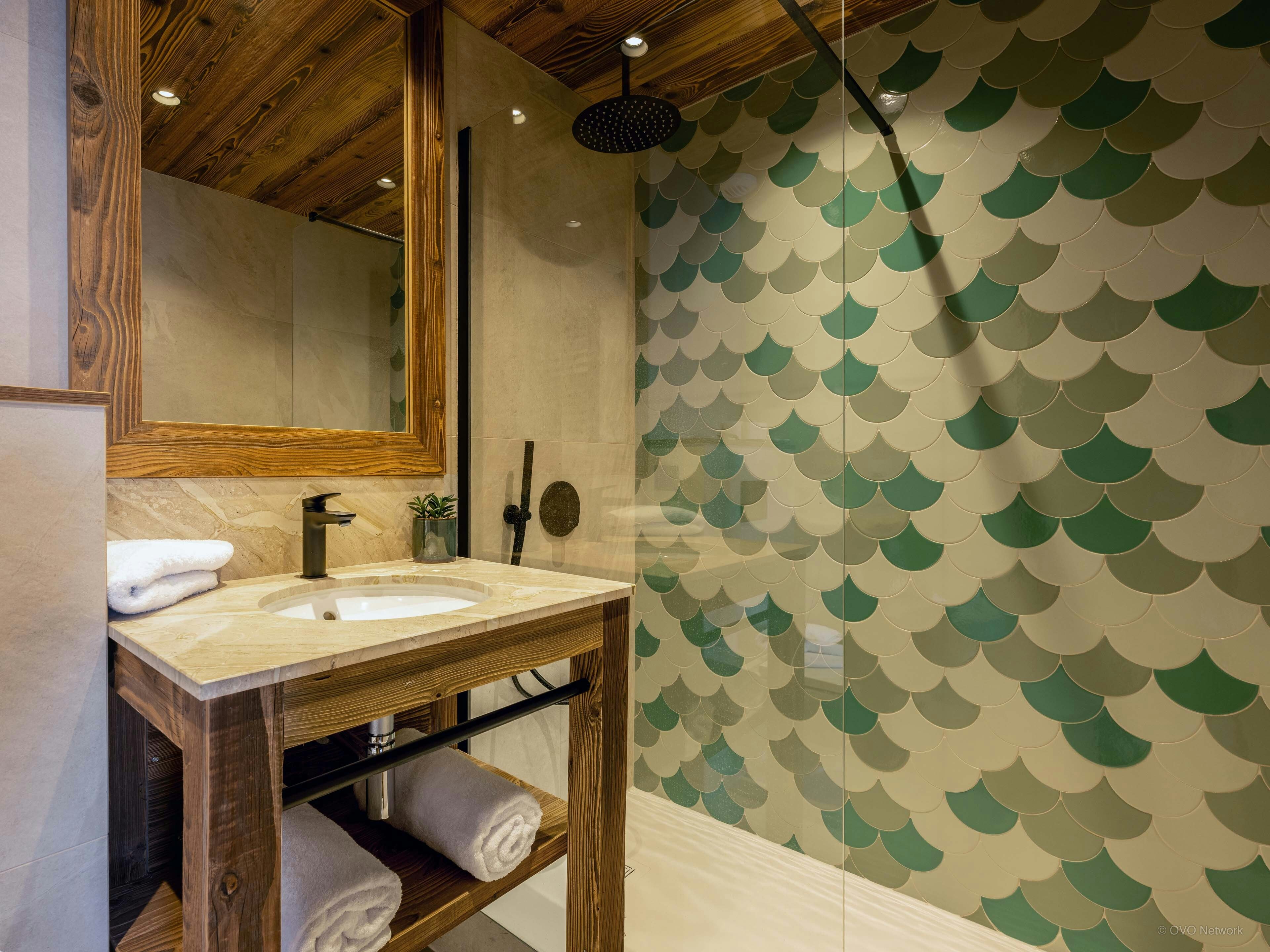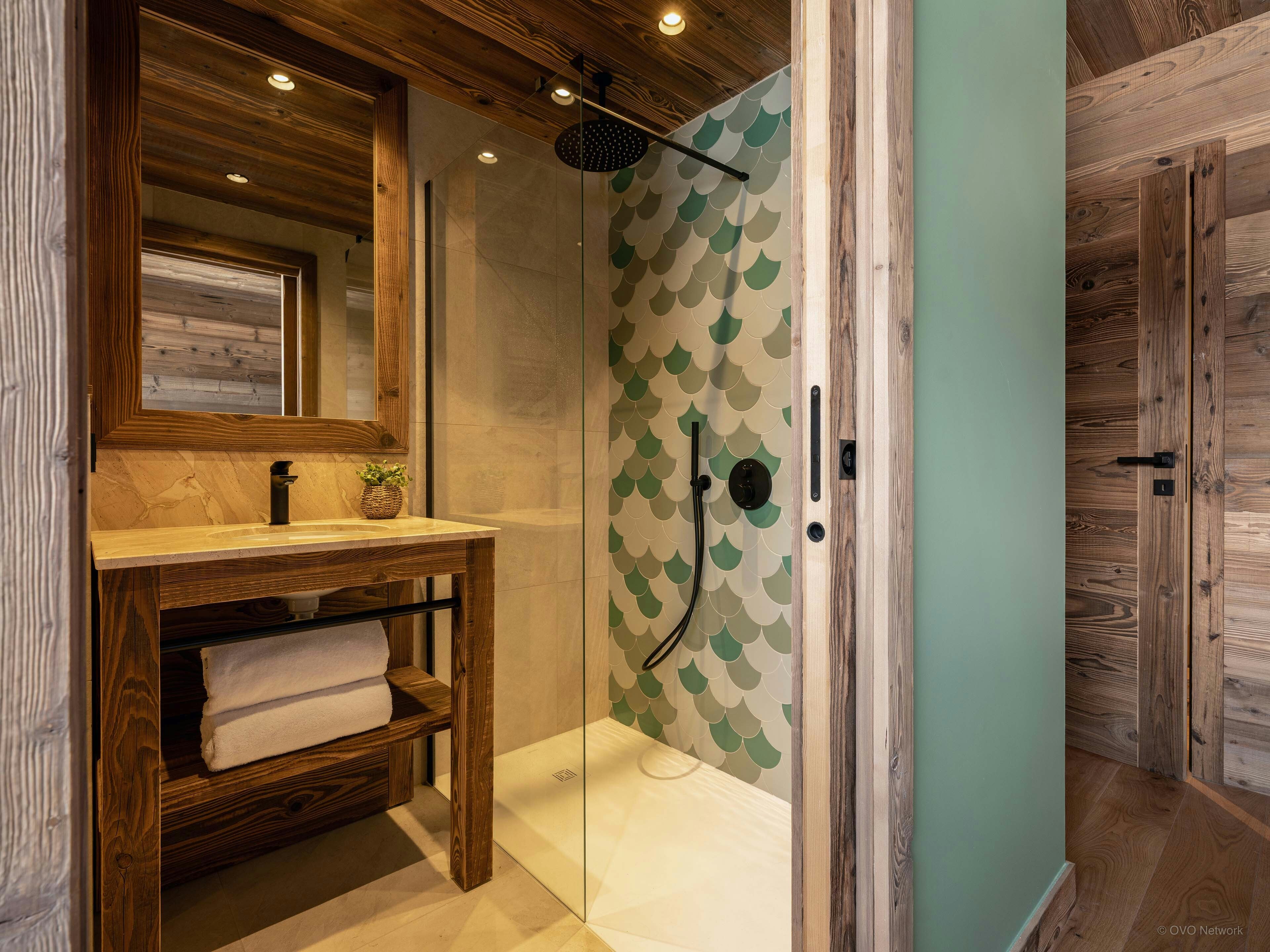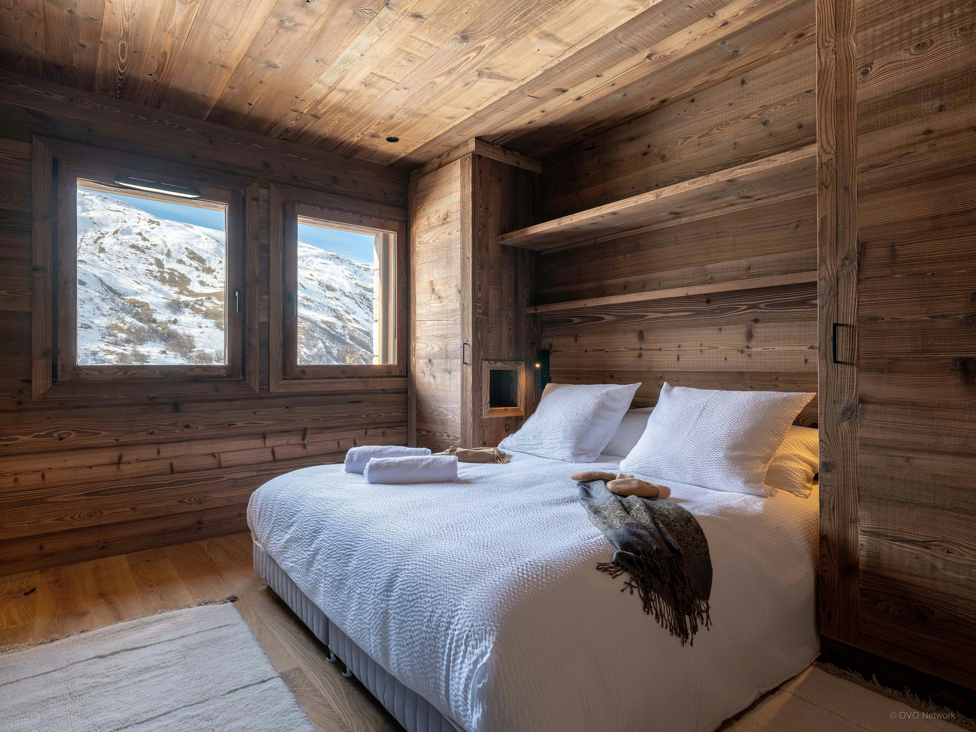 There are five double en-suite bedrooms on the lower floor, as well as a children’s room for four. This floor also houses the chalet's wellness area, with a sauna, steam room, and a gym that opens onto a terrace with a hot tub.