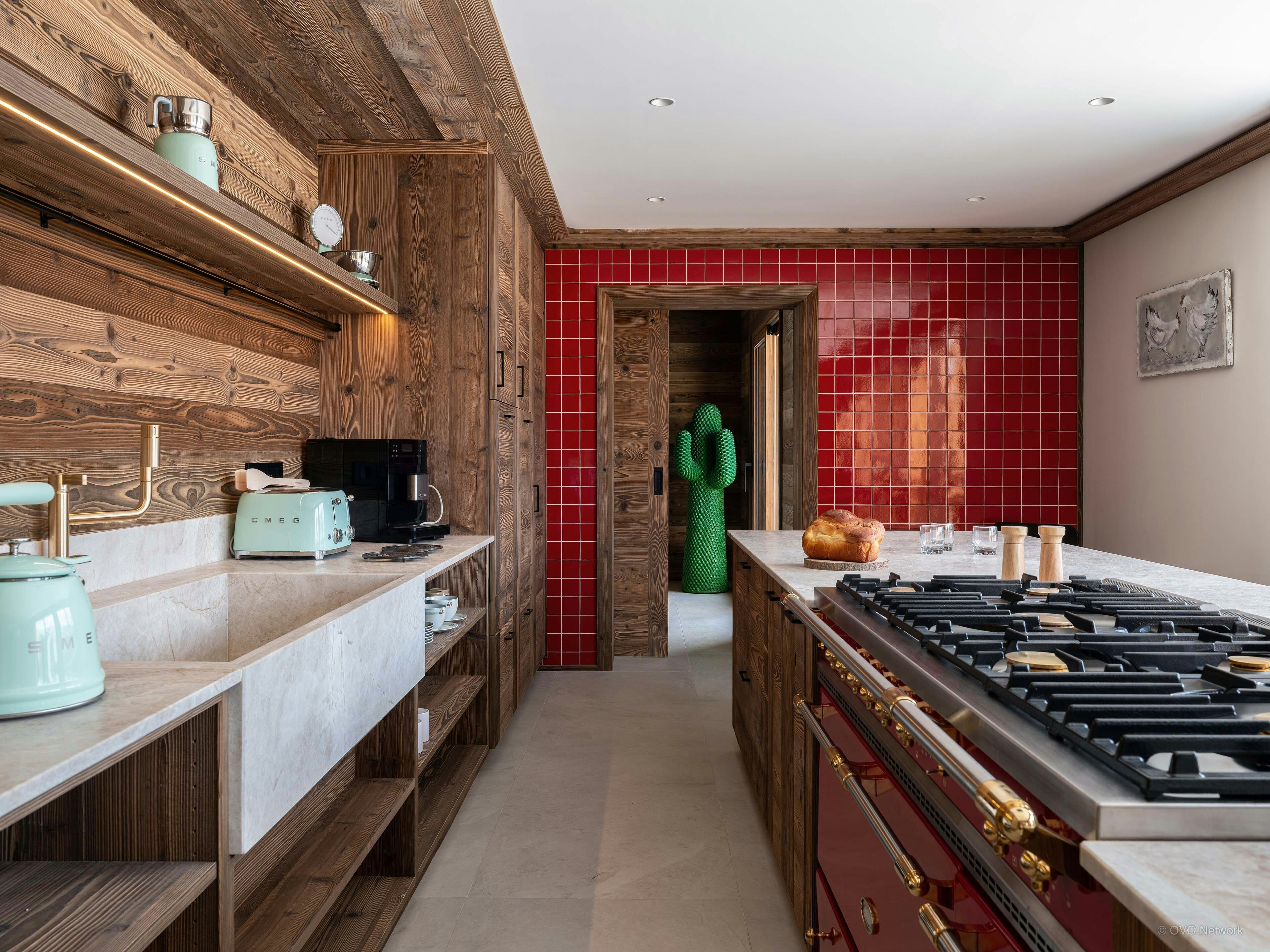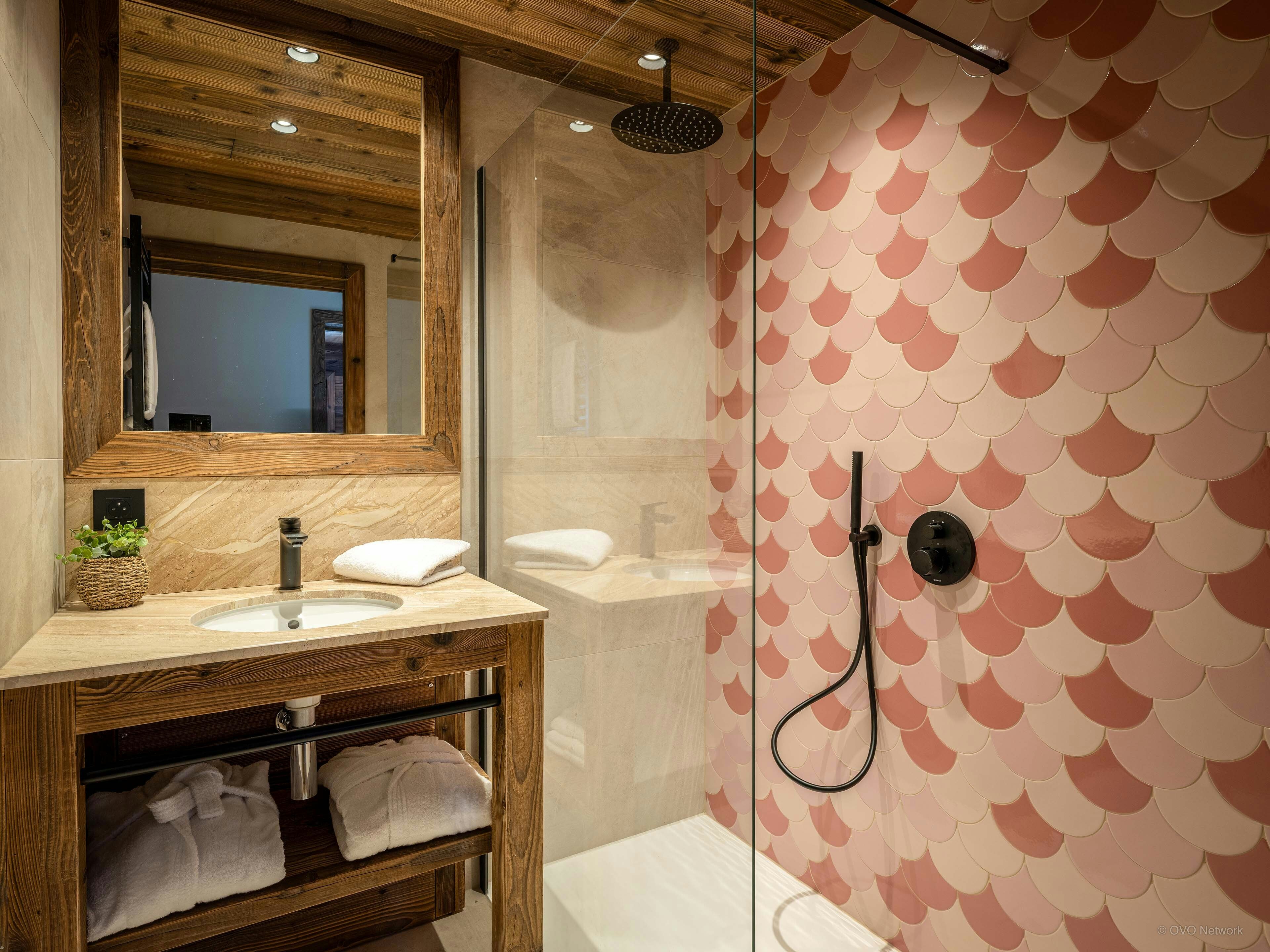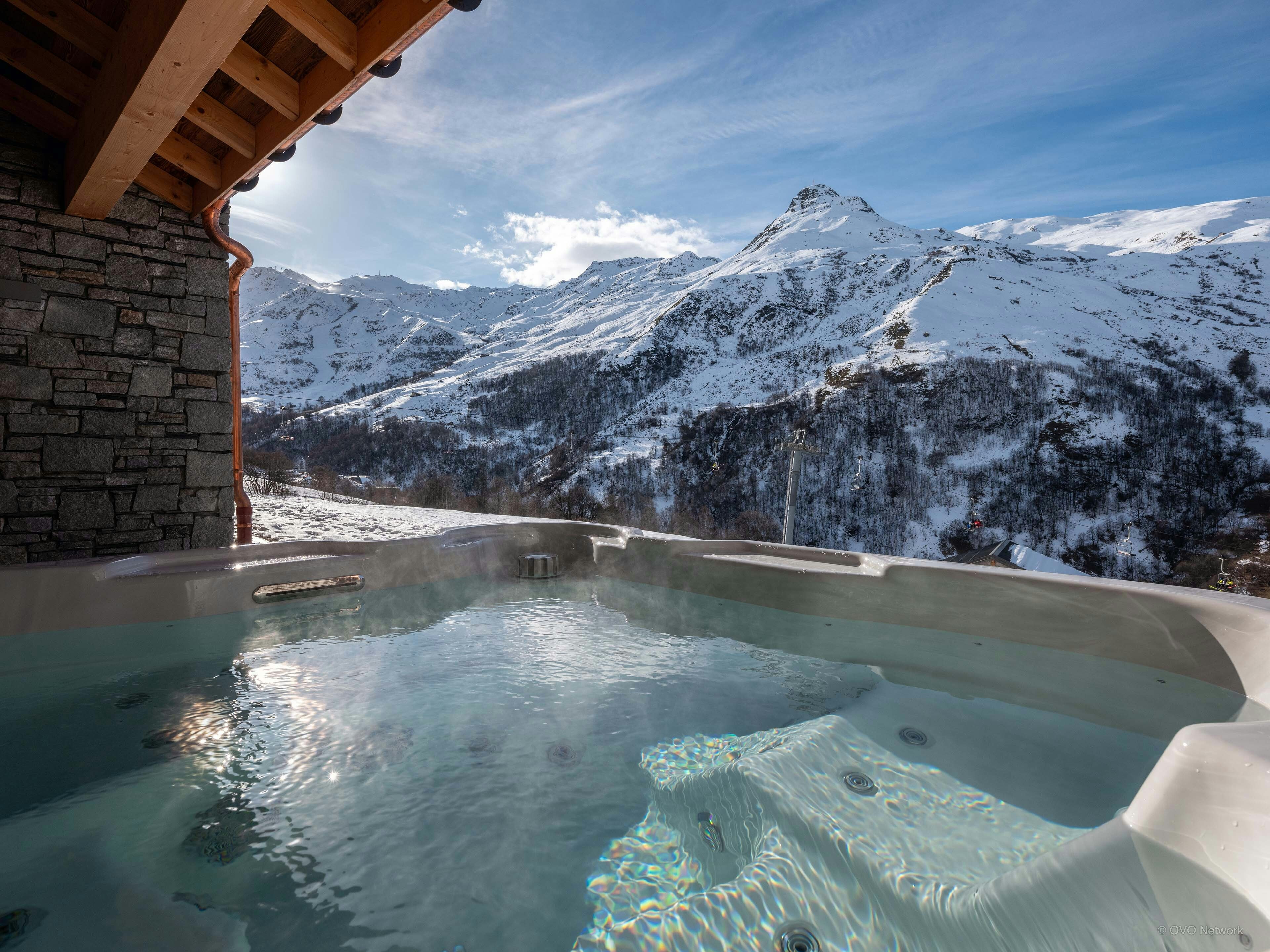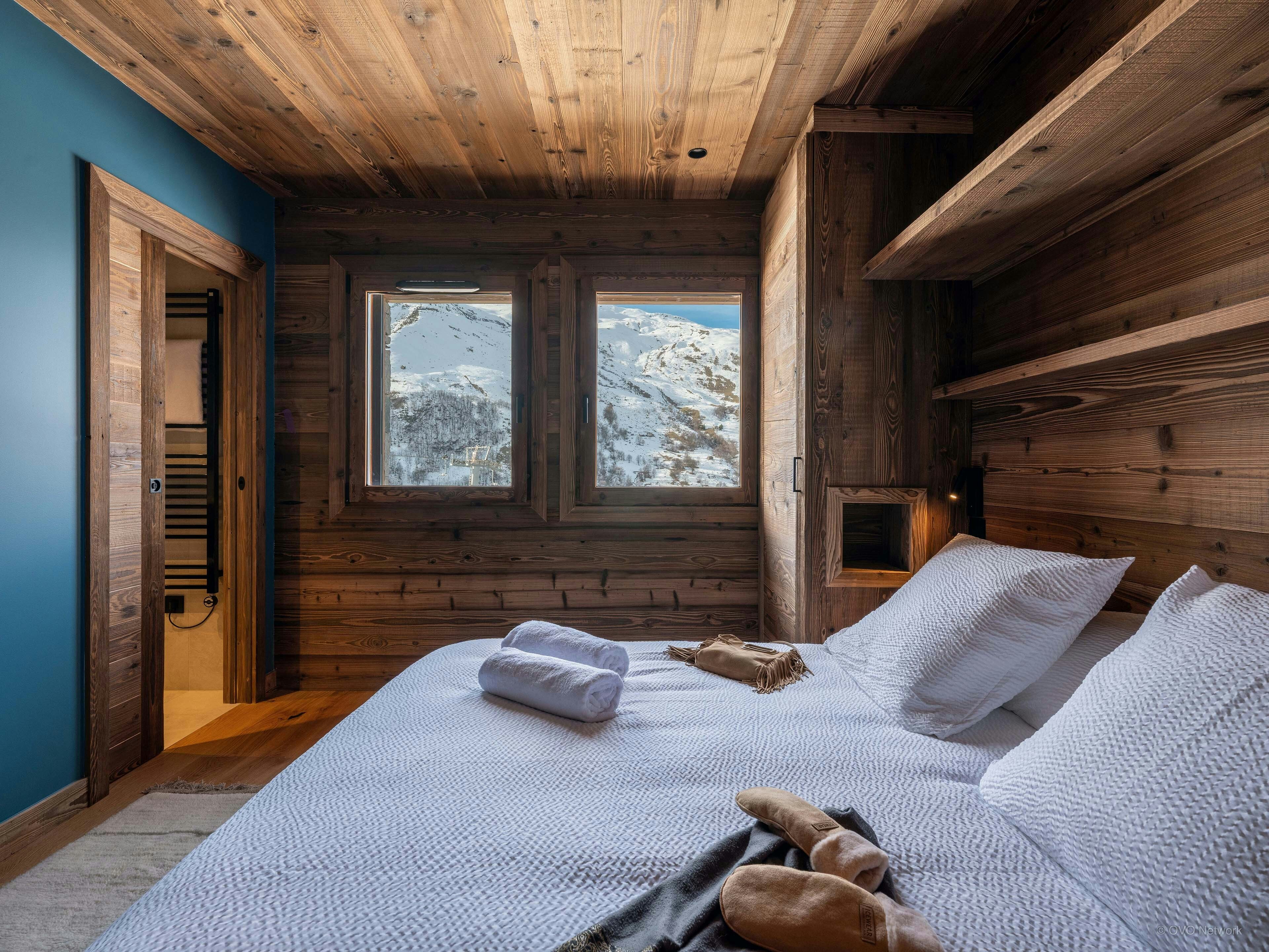 There are five double en-suite bedrooms on the lower floor, as well as a children’s room for four. This floor also houses the chalet's wellness area, with a sauna, steam room, and a gym that opens onto a terrace with a hot tub.