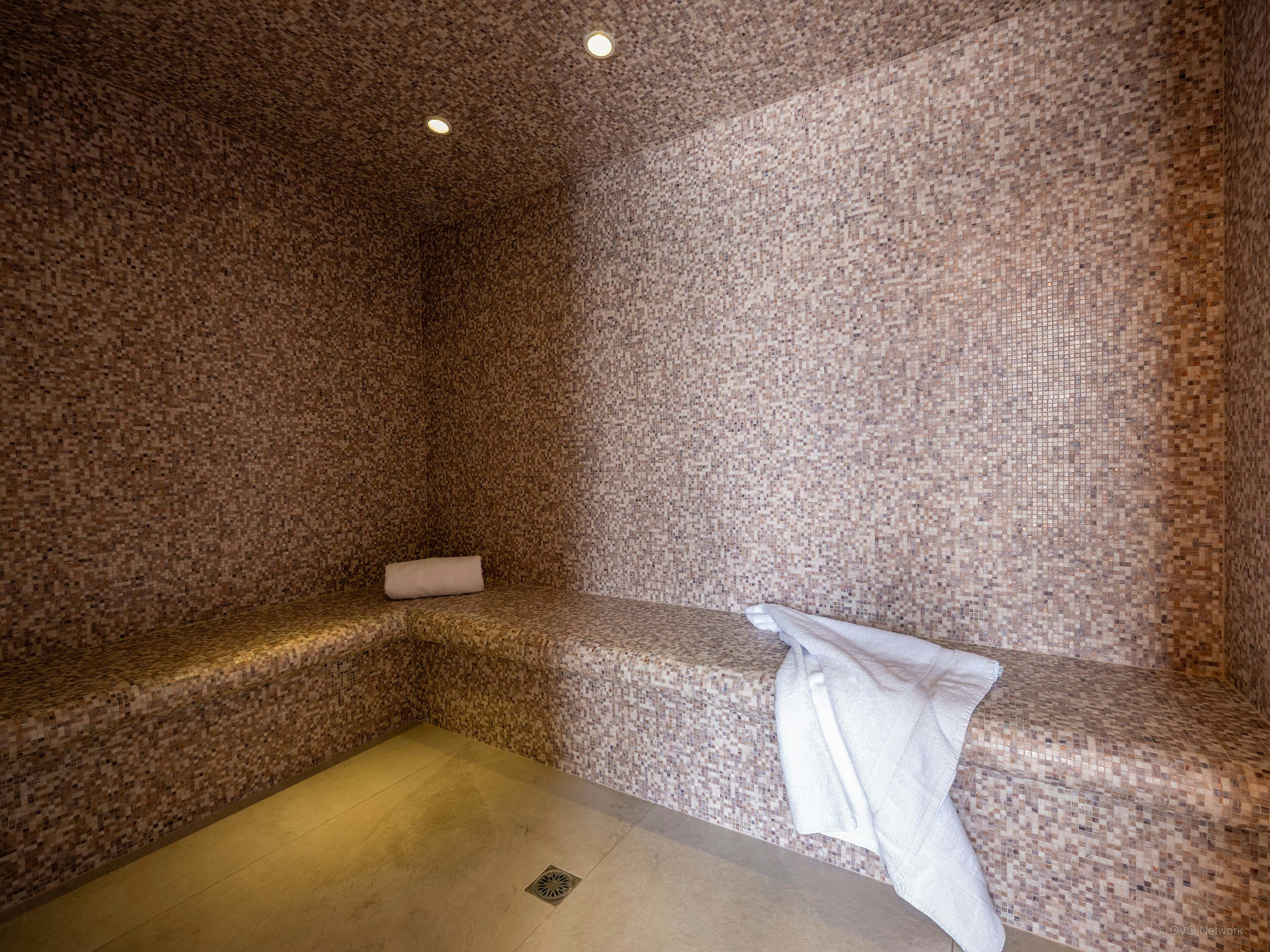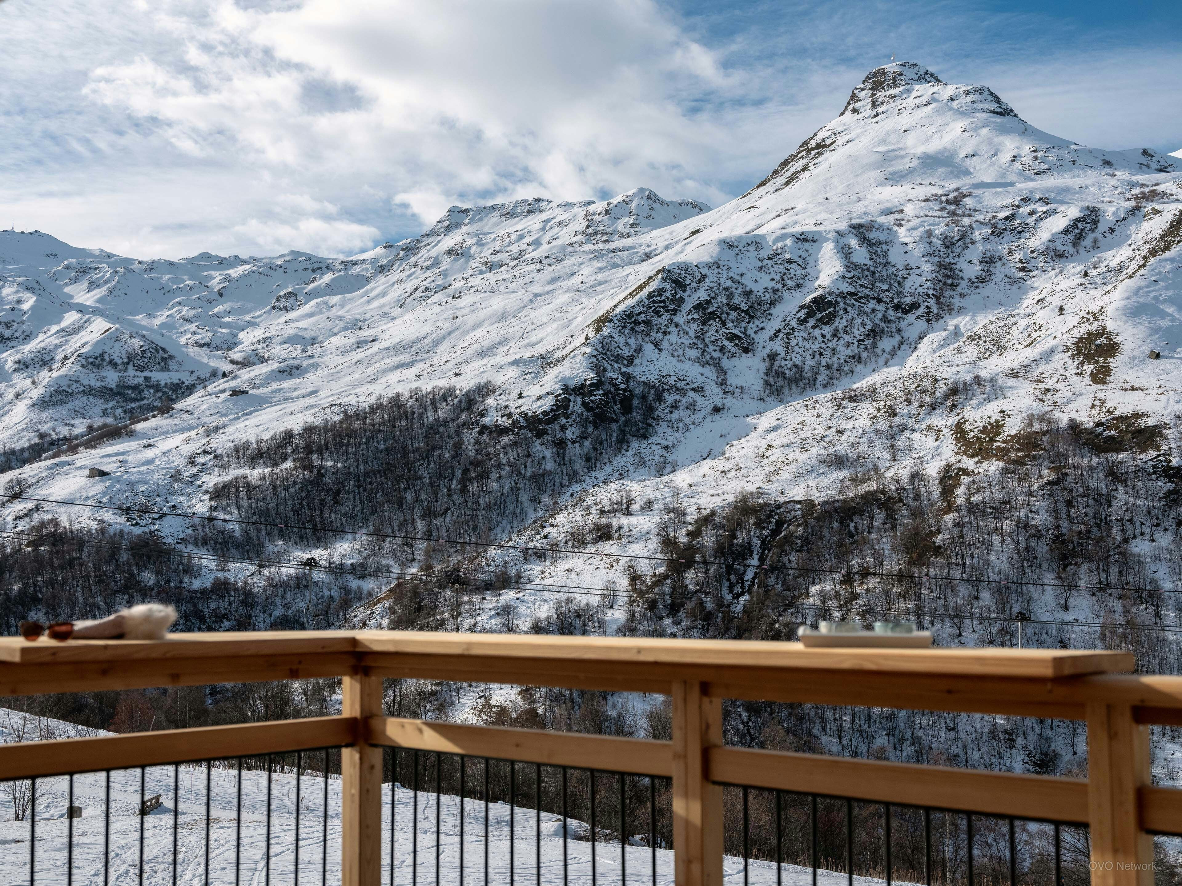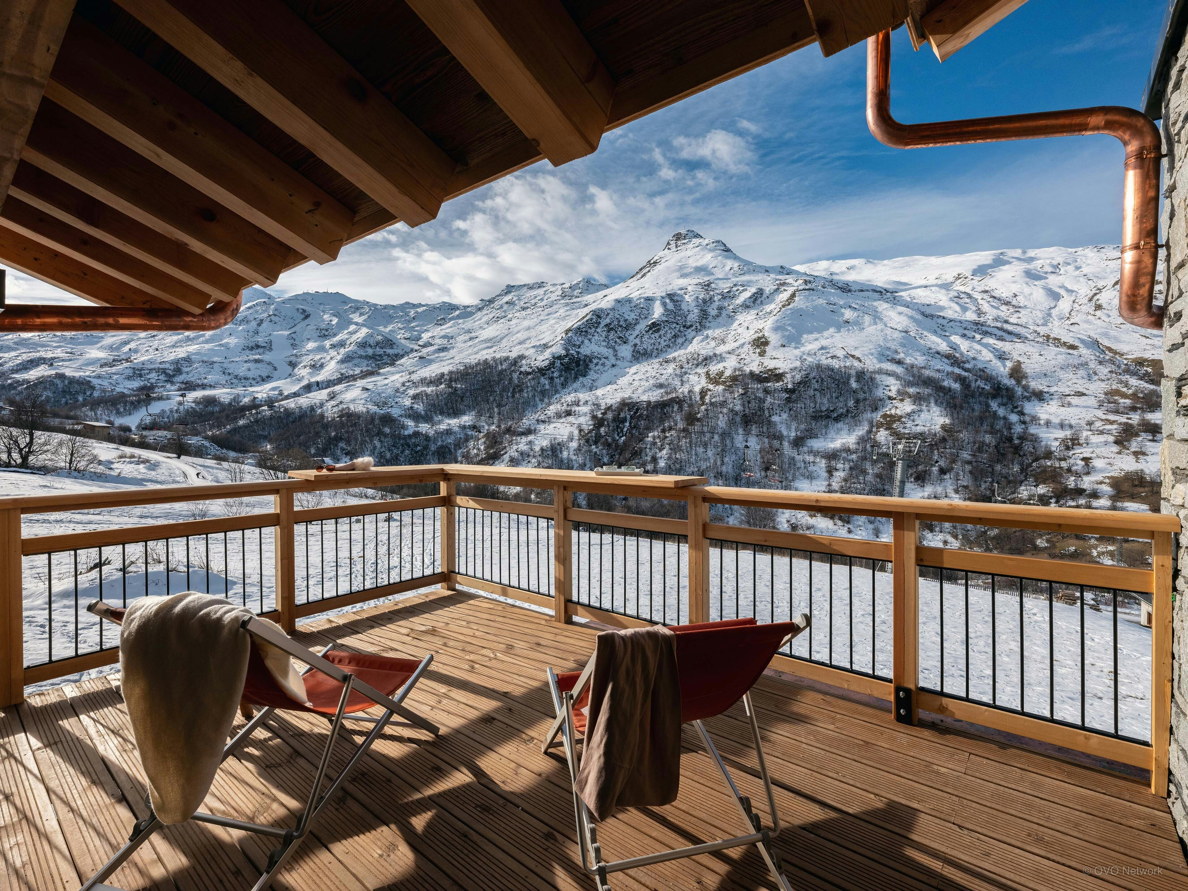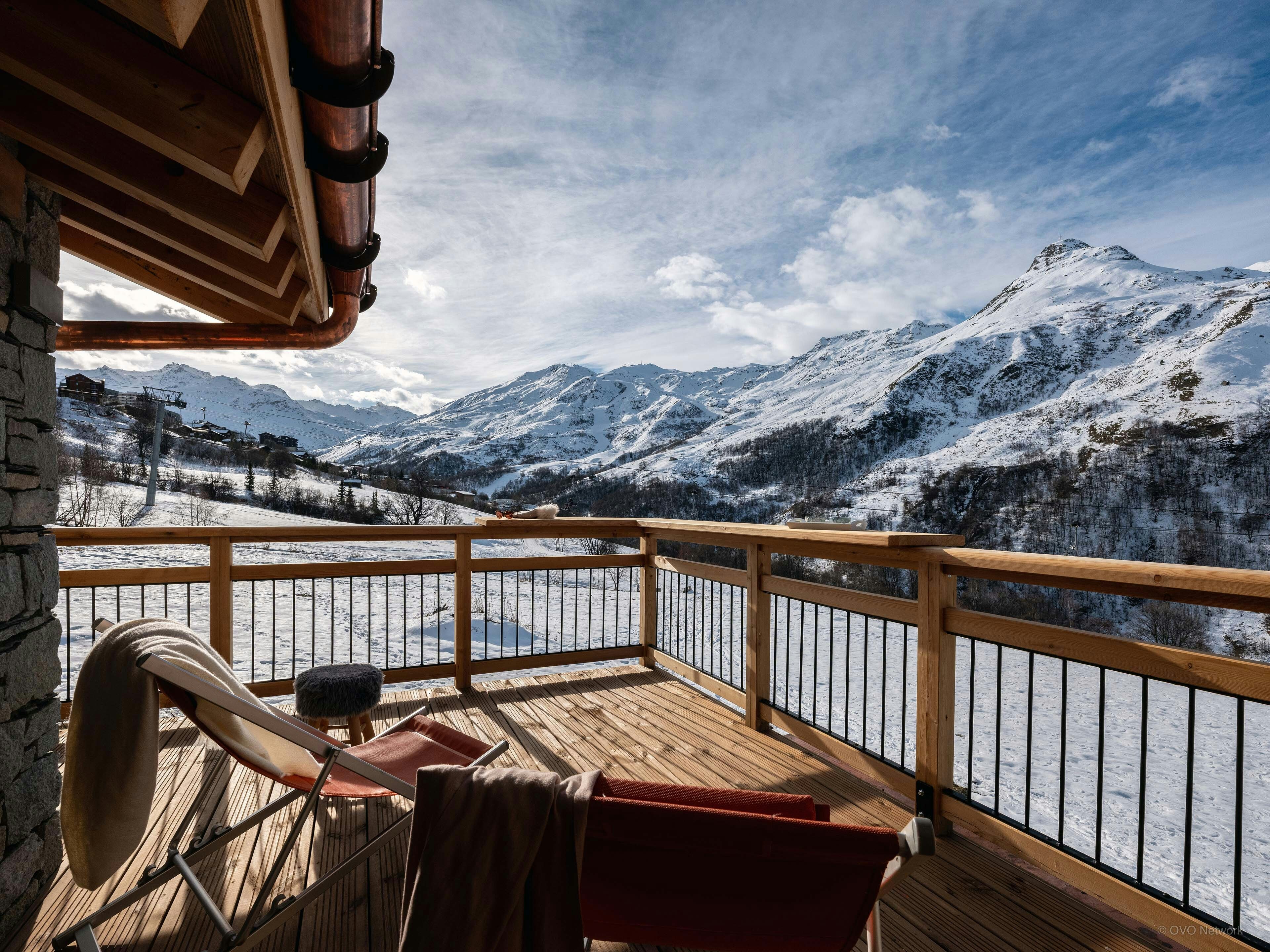 There are five double en-suite bedrooms on the lower floor, as well as a children’s room for four. This floor also houses the chalet's wellness area, with a sauna, steam room, and a gym that opens onto a terrace with a hot tub.