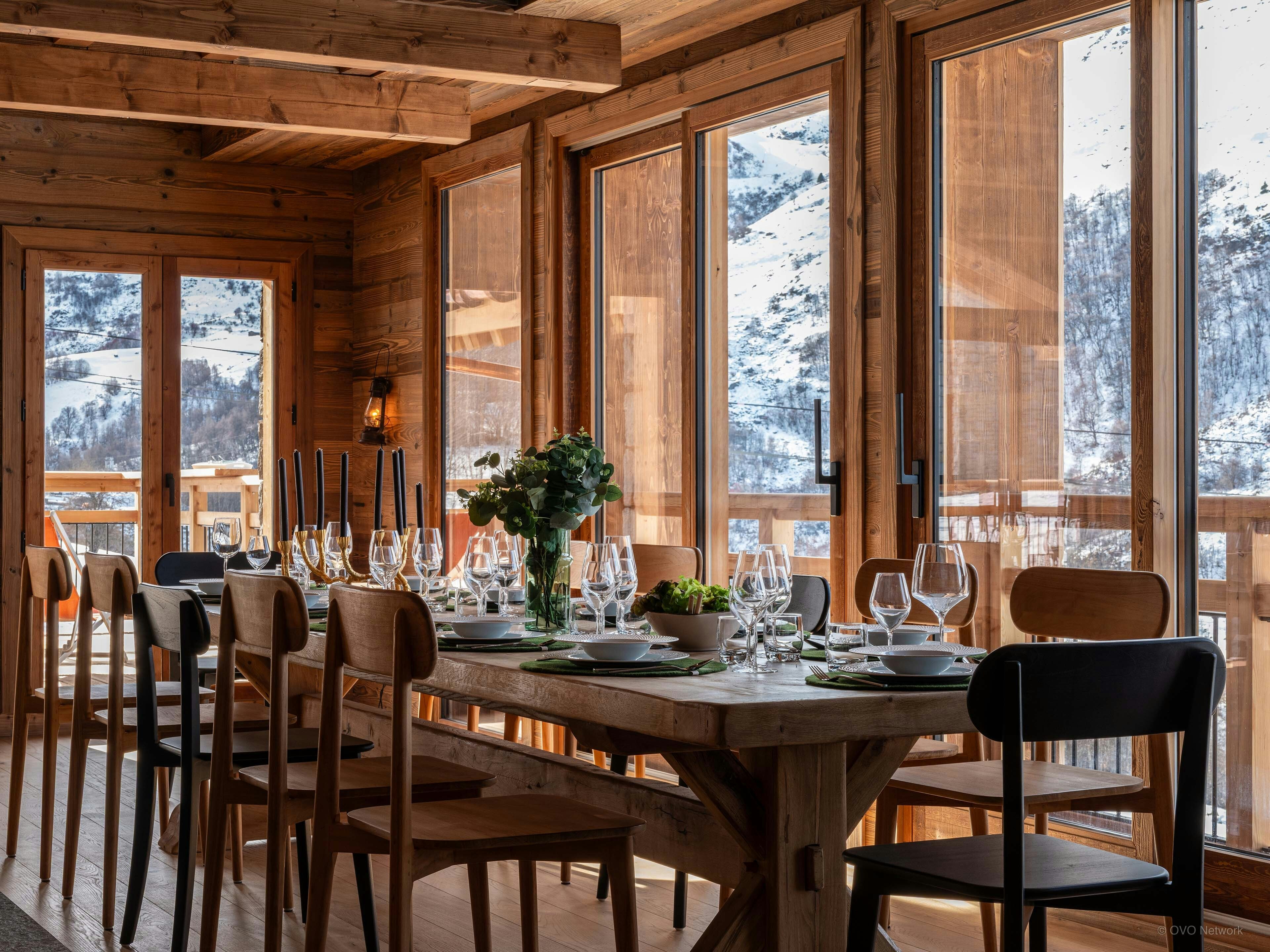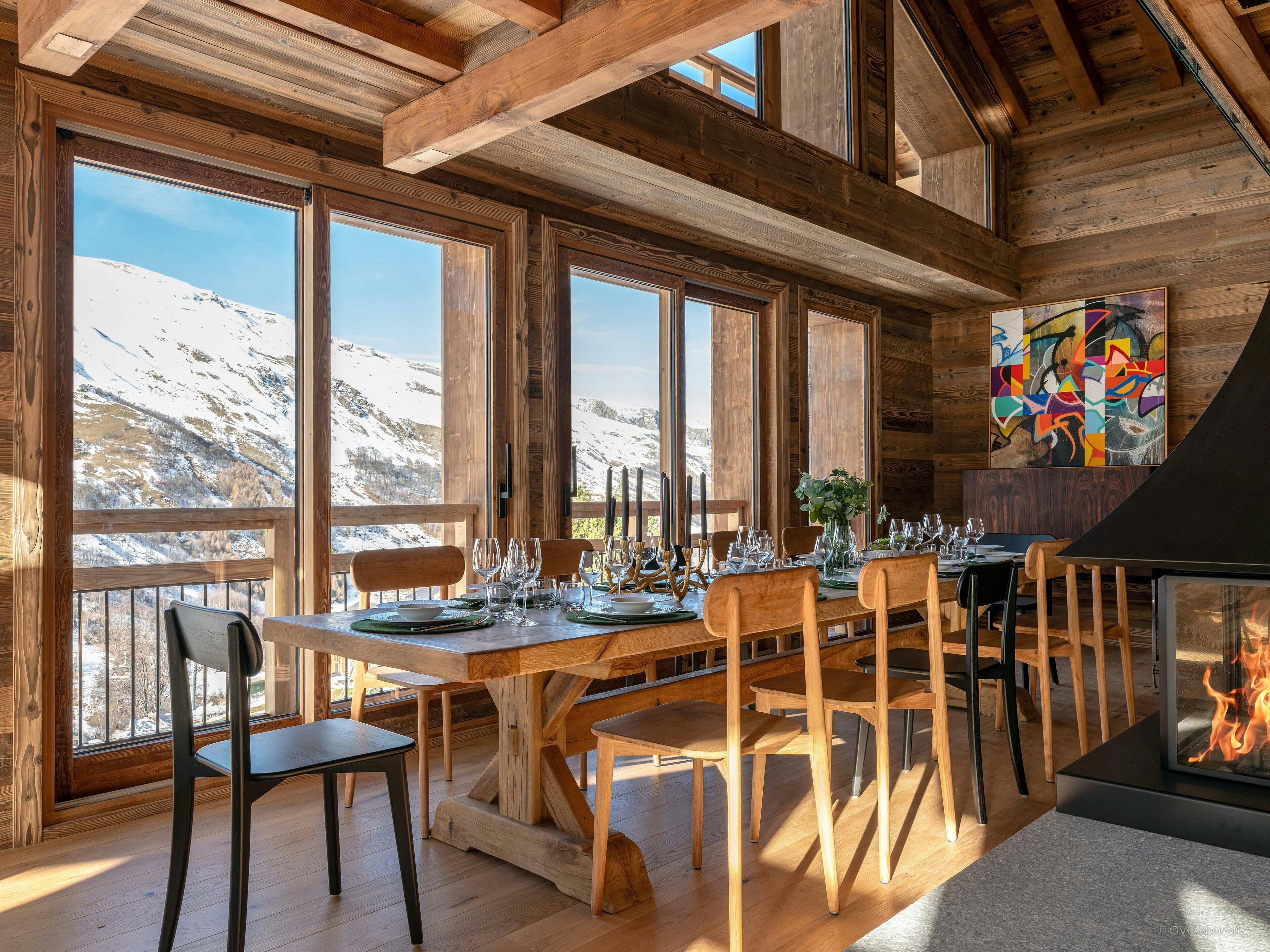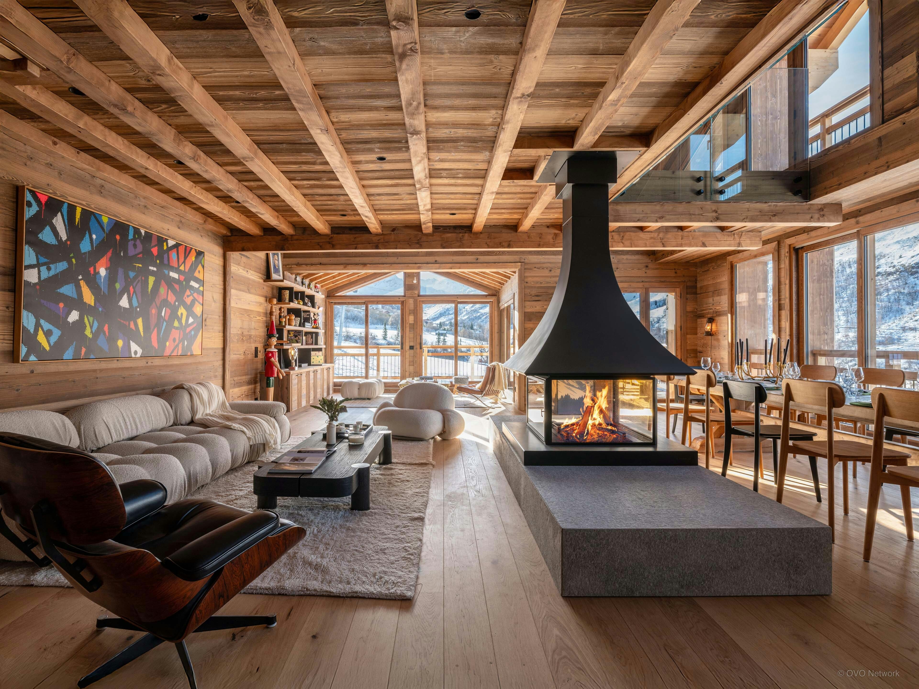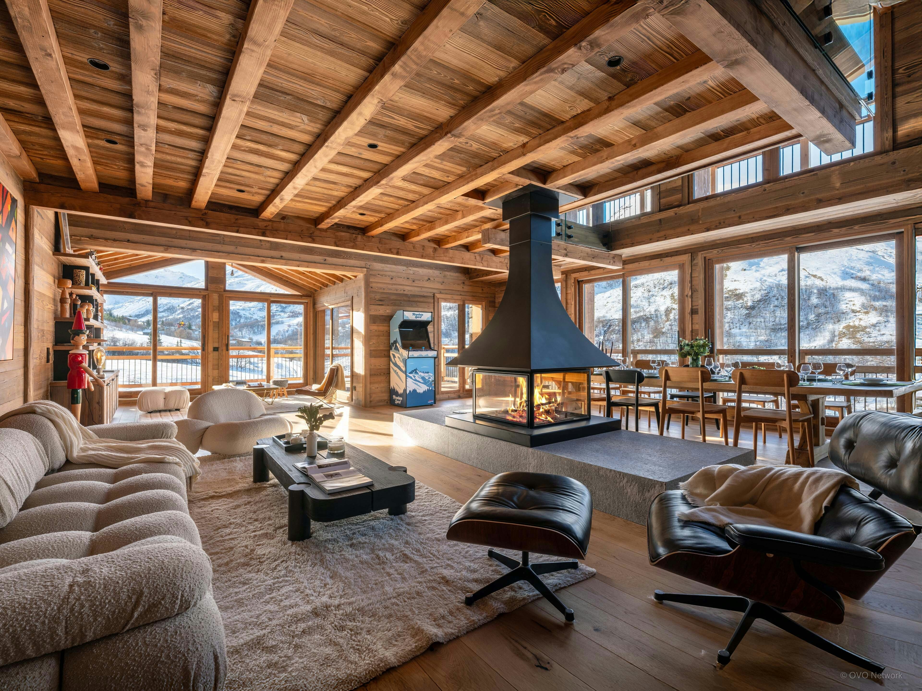 In the large living room at the heart of the chalet, you’ll be impressed by the natural light and elegant decor. A superb central fireplace separates the comfortable seating area from the dining table, while a cosy reading corner offers a more peaceful space.