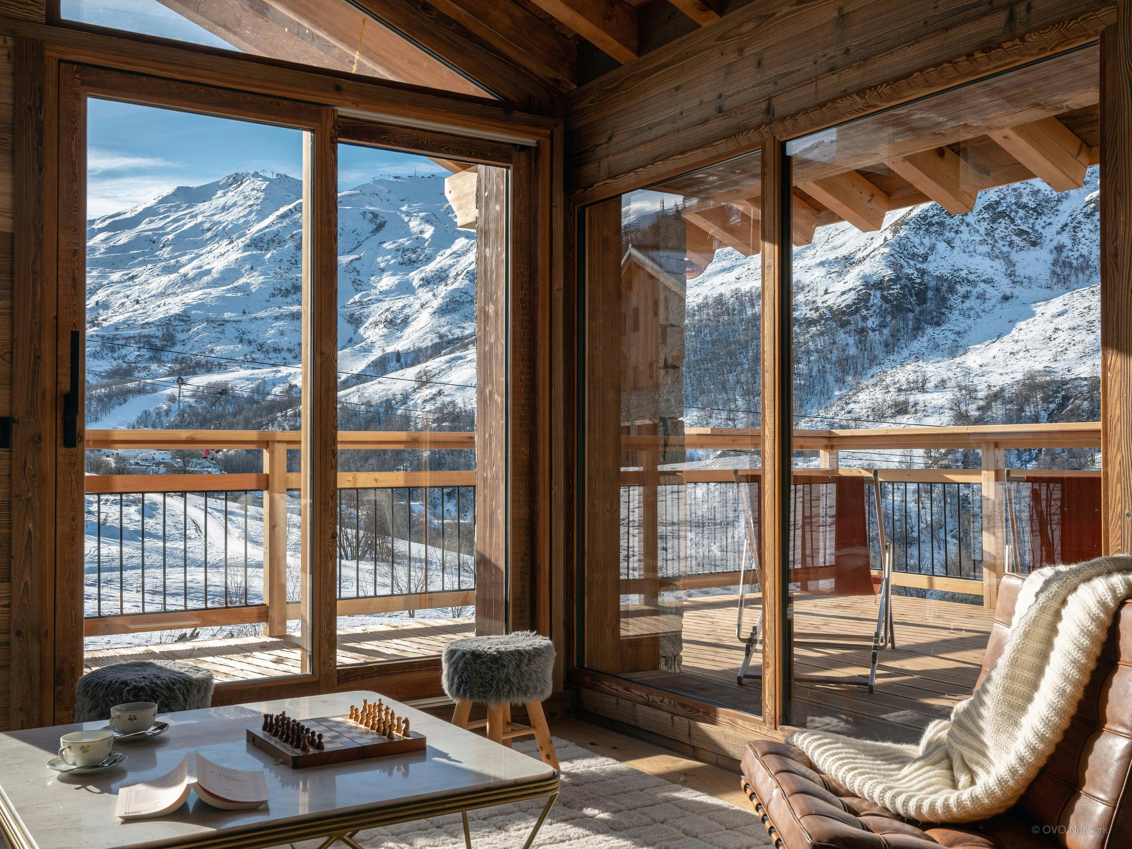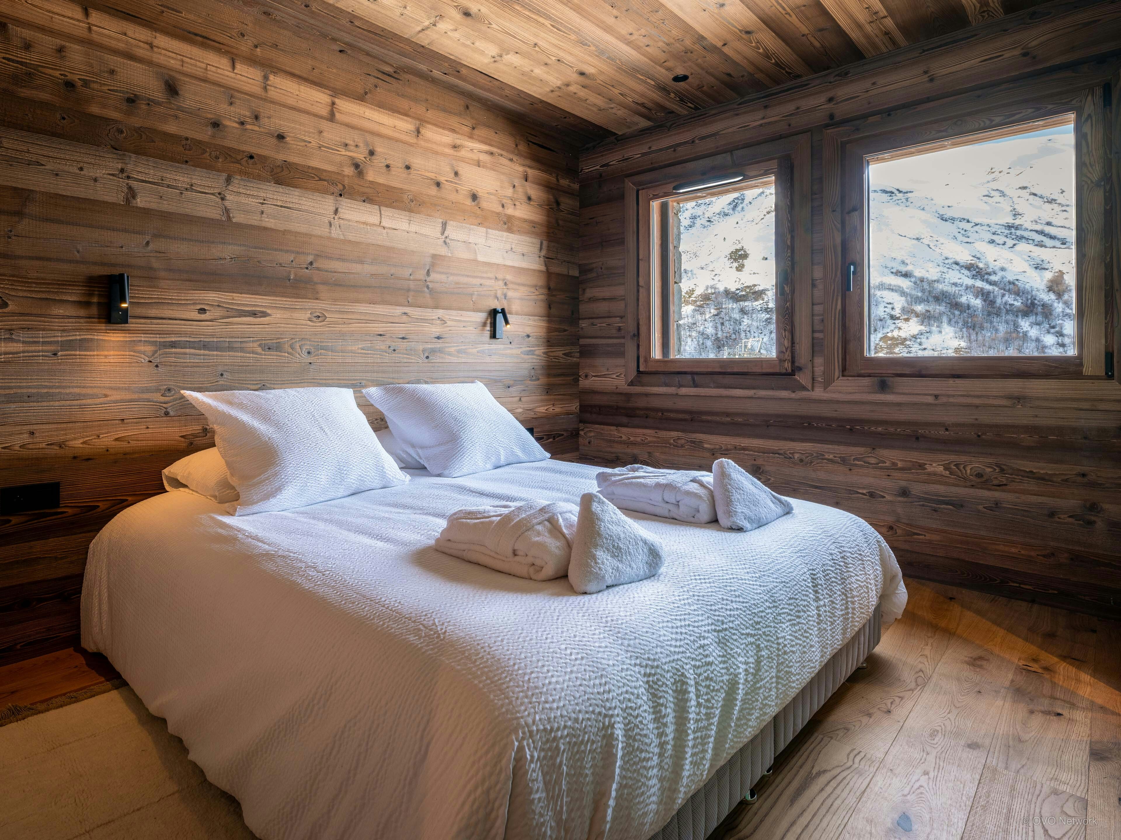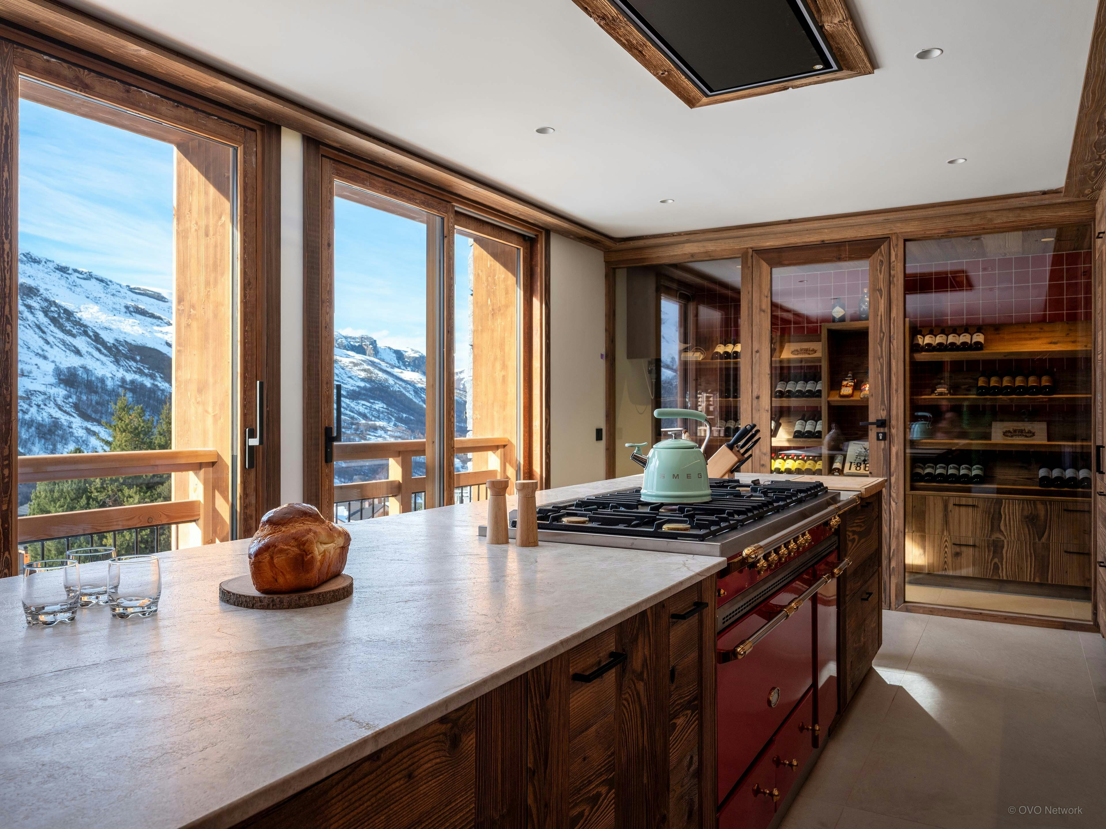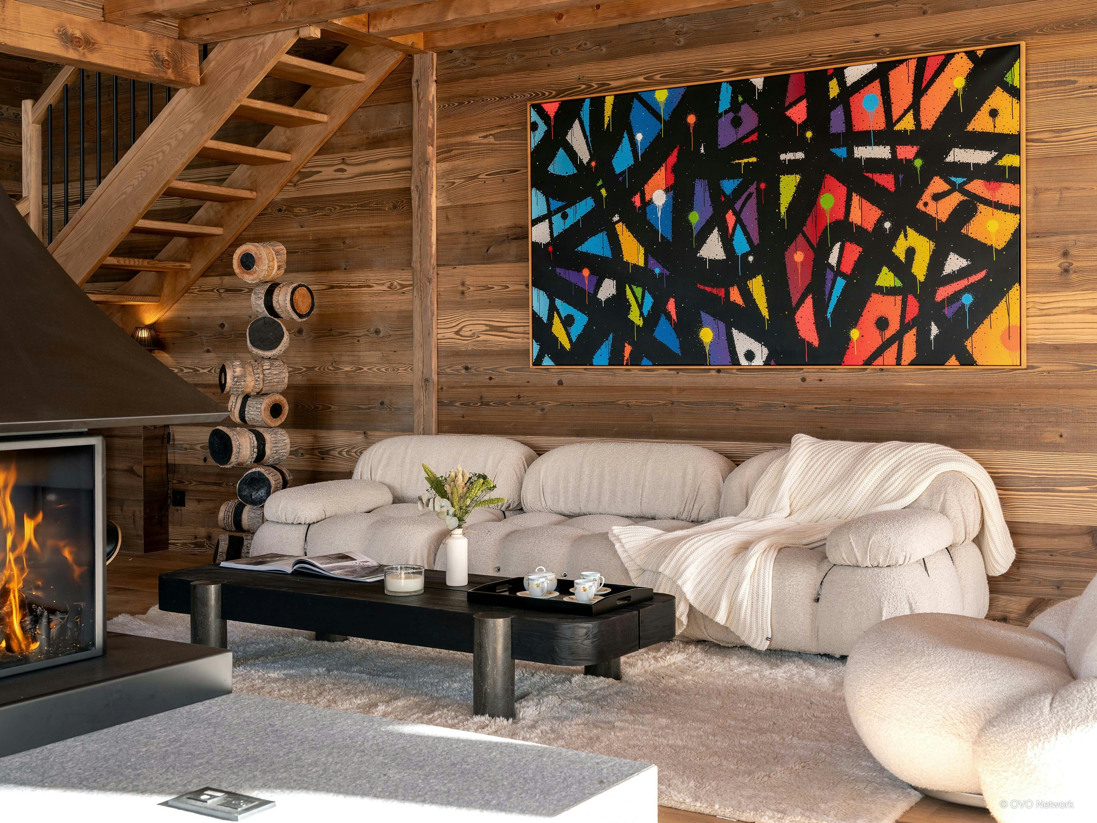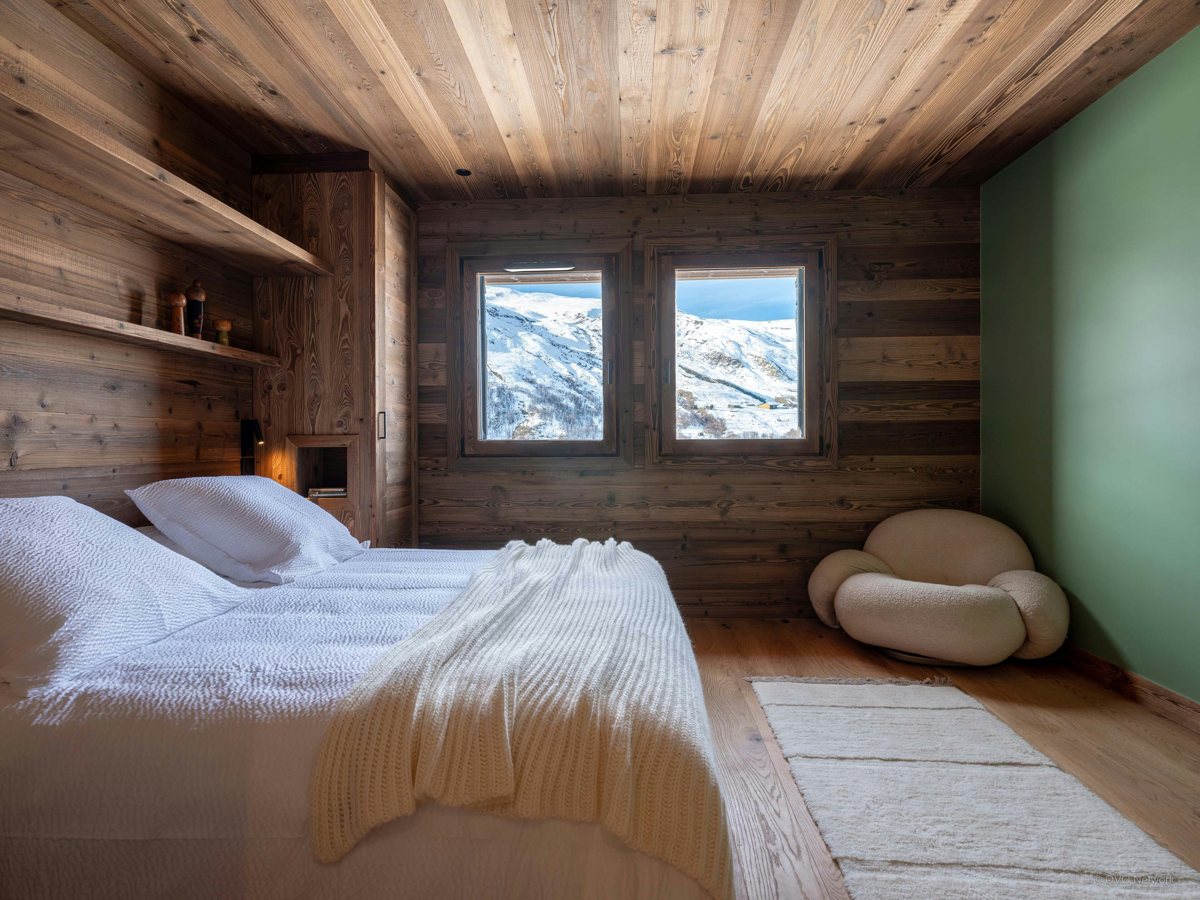 In the large living room at the heart of the chalet, you’ll be impressed by the natural light and elegant decor. A superb central fireplace separates the comfortable seating area from the dining table, while a cosy reading corner offers a more peaceful space.